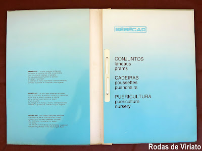 Numa parte inicial do catálogo da Bébécar há uma secção onde são apresentados conjuntos, cadeiras e artigos de puericultura da marca. Na imagem anterior podemos ver uma cadeira para passeio de bebé fotografada em 3 situações distintas, exibindo-se deste modo as diferentes configurações que permitia ter.
