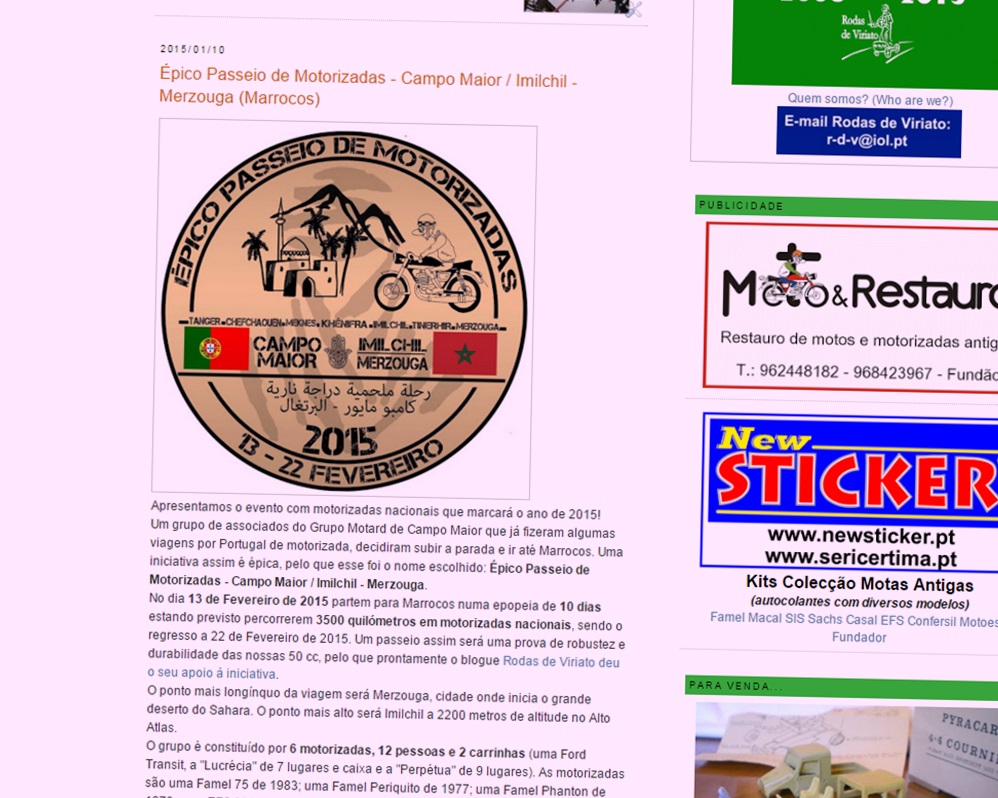 Em 4.º lugar colocamos os eventos que apoiamos, sejam encontros ou concentrações de bicicletas ou de motorizadas; como passeios que se revestem de especial destaque pela extensão e dificuldade a que se propuseram. Foi o caso do Épico Passeio de Motorizadas - Campo Maior / Imilchil - Merzouga ou do Farruncas no Asfalto - Apresentação Viagem Lisboa / Madrid. As motorizadas nacionais estão vivas, a rolar e prontas para levar aventureiros até onde eles quiserem!