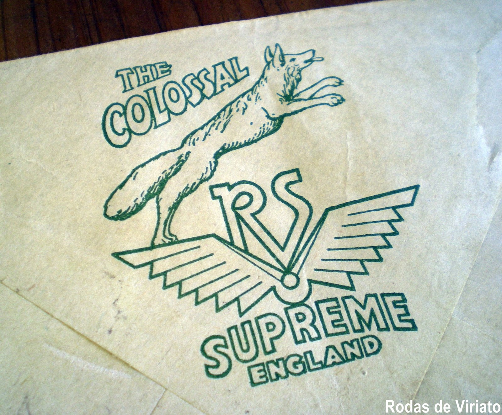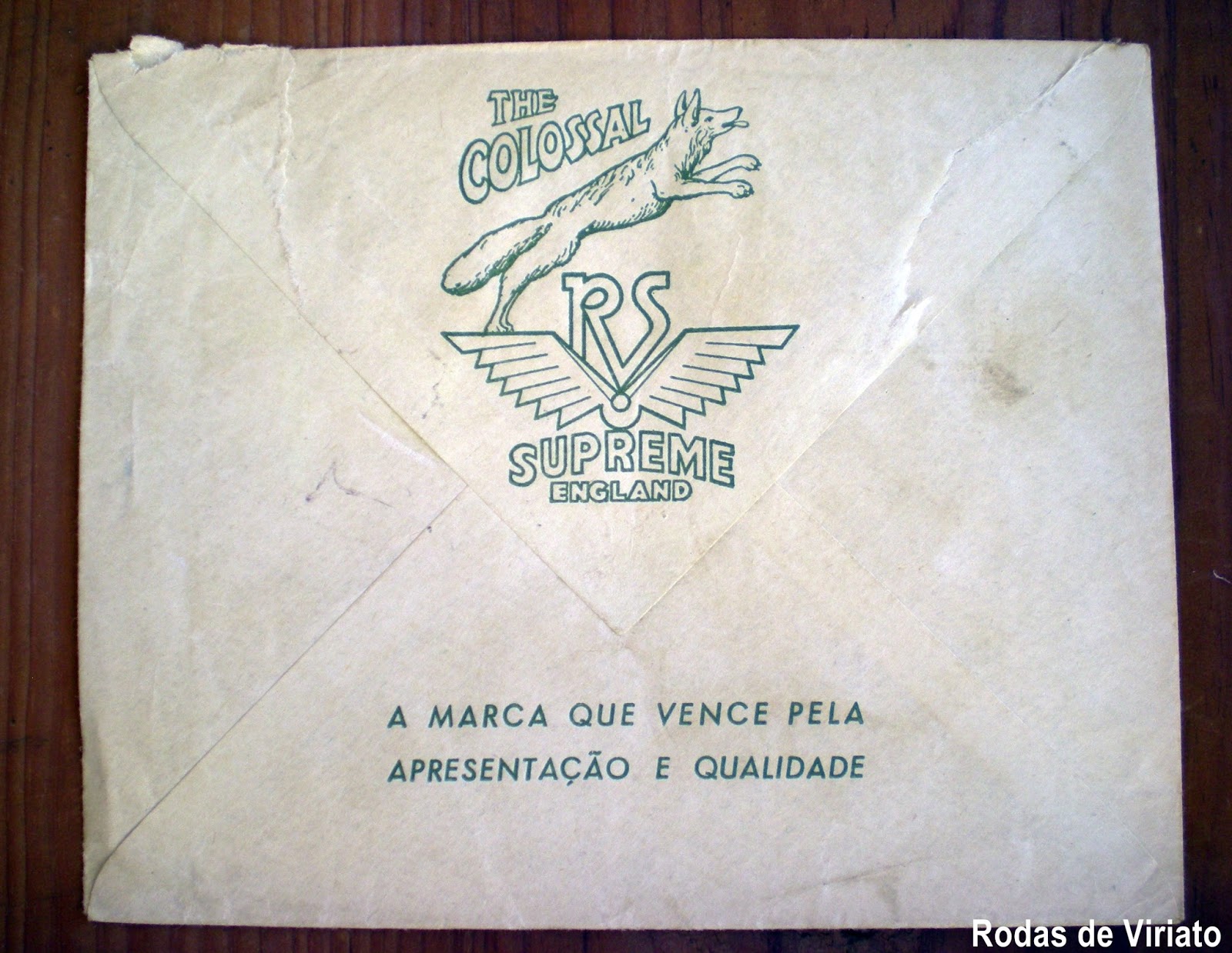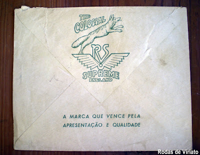 Este envelope antigo tem carimbo de 11 de Novembro de 1952 e no verso tem impressa uma imagem de um lobo a saltar, sendo encimado pelas letras The Colossal. O mesmo lobo tem as patas traseiras colocadas sobre umas asas estilizadas que no meio têm as letras RS. Por baixo está escrito Supreme England.