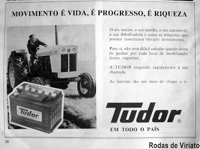 Tudor - Movimento é vida, é progresso, é riqueza. Da frase em destaque na publicidade, passamos para um pequeno texto em que as baterias Tudor são apresentadas como a garantia de que veículos e máquinas não ficam imobilizadas quando se precisa delas para ganhar a vida.