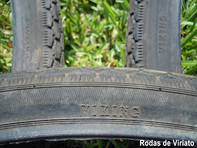 O da frente era um pneu de piso listado Viking de medida 2 3/4 - 17 (21 x 2.75) 38 J.