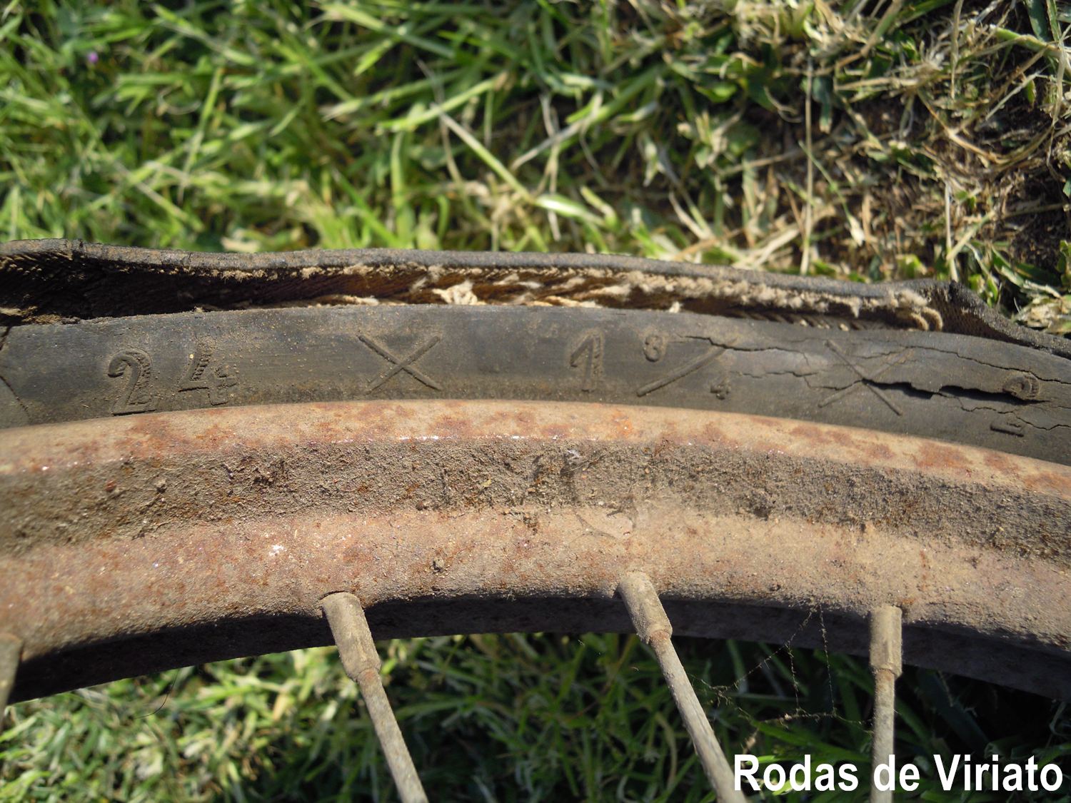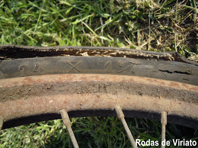 Na zona do eixo de simetria do pneu, ainda se vêem restos da borracha que ficou da junção das duas partes do molde, e que serve de prova de que nunca foi usado.